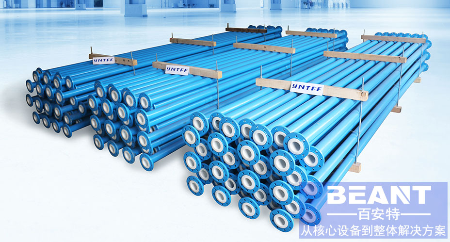 襯氟推壓管道是將鋼件焊接加工完成后,將PTFE成品塑料管通過(guò)機(jī)械拉力拉入預(yù)制好的直管中,使內(nèi)襯層與鋼件緊密結(jié)合;然后通過(guò)火焰加熱或鹽藥水加熱,使密封普通PTFE管到一定溫度,翻邊成型為密封面;后再進(jìn)行應(yīng)力消除。