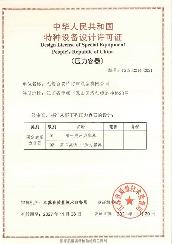 百安特石化裝備(江蘇)有限公司 坐落在美麗的湖濱城市無(wú)錫,百安特自成立起一直專注于從事化工防腐蝕設(shè)備的研發(fā)設(shè)計(jì)與生產(chǎn)制造,針對(duì)客戶的生產(chǎn)工藝提供最優(yōu)的防腐蝕解決方案及產(chǎn)品選型。公司總?cè)藬?shù)約86人,擁有D1、D2類壓力容器生產(chǎn)資質(zhì),其中設(shè)計(jì)研發(fā)人員12人以上,資深防腐工程師5人以上。